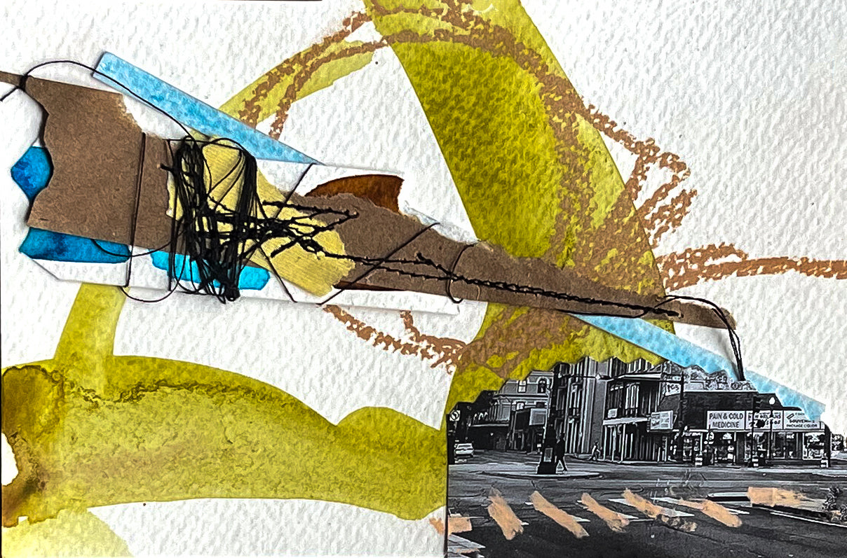 Mixed media on paper- watercolor, pastel, ephemera and thread