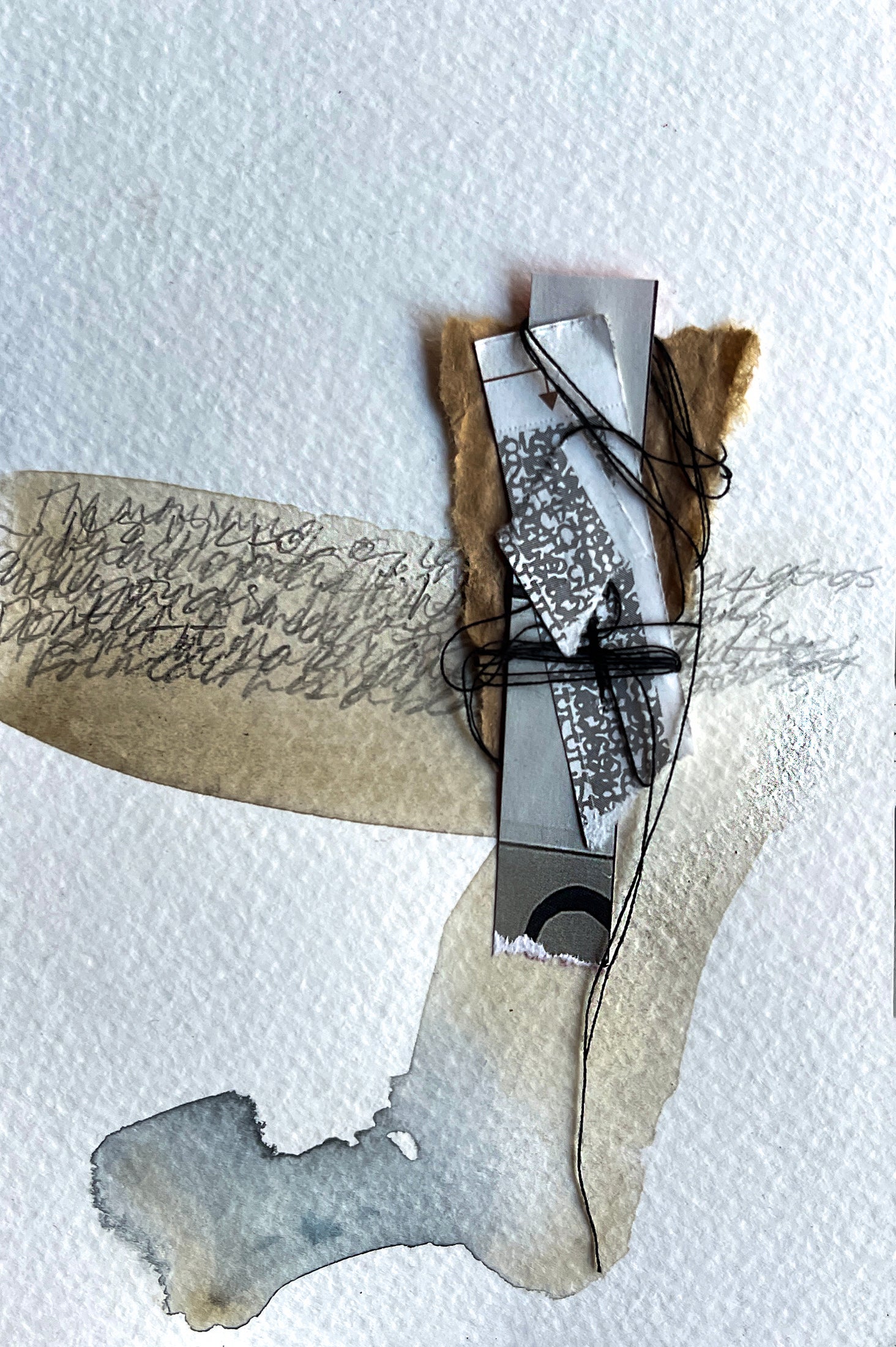 Mixed media on paper- watercolor, journal entries in pencil, ephemera and thread